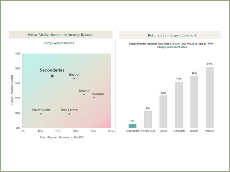 One prevailing belief is that secondaries are merely discounted assets acquired out of necessity by sellers. In reality, the role of secondaries is far broader. Their diversification, lower loss rates, and historically consistent return profile make them well suited as a core allocation within private markets portfolios rather than an opportunistic addition.